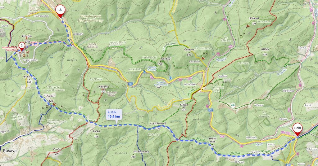 Z parkoviště na Trojáku po modré tur. značce směr Hrubá jedle na rozcestí Holý vrch. Odtud po zelené na rozcestník Skalný a dále po modré a zelené naučné stezce až na Sv. Hostýn. Tady pokračujeme po červené směr Chvalčov, zde se napojíme doleva po žluté až k Hotelu Říka – parkoviště, kde nás bude čekat autobus.